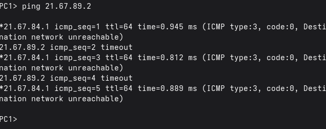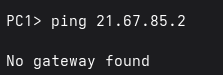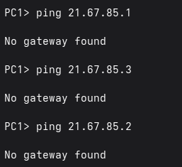 To test this, I pinged PC5 (in the Green subnet) from PC1 (in the Blue subnet). It did not succeed due to a No gateway found error. This means that PCs in each subnet do not know where to route the packets they intend to be sent to another subnet. It can communicate with the router at 21.67.84.1, however it is not configured as a router so it "doesn't know" that the devices at that IP address is a router.