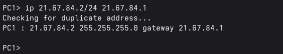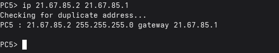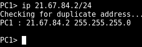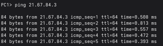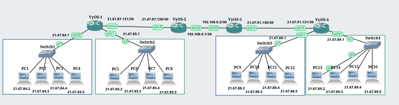 The network is set up as shown. For the particular PCs, I reserved the 21.67.xx.1 addresses for the routers and counted up from there to assign addresses to the PCs. For example, PC4 is 21.67.84.5.