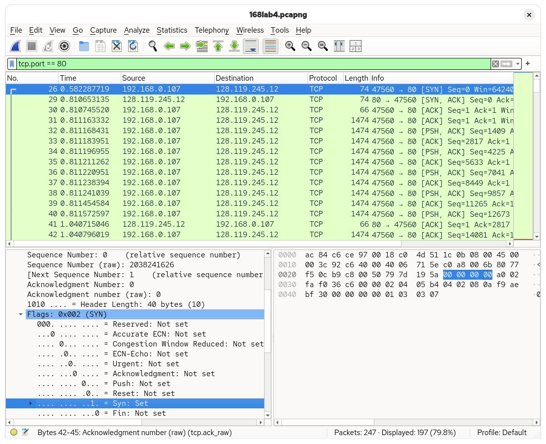 SYN— sequence numbers between the two participants. In this case, the sequence number is2038241626.
