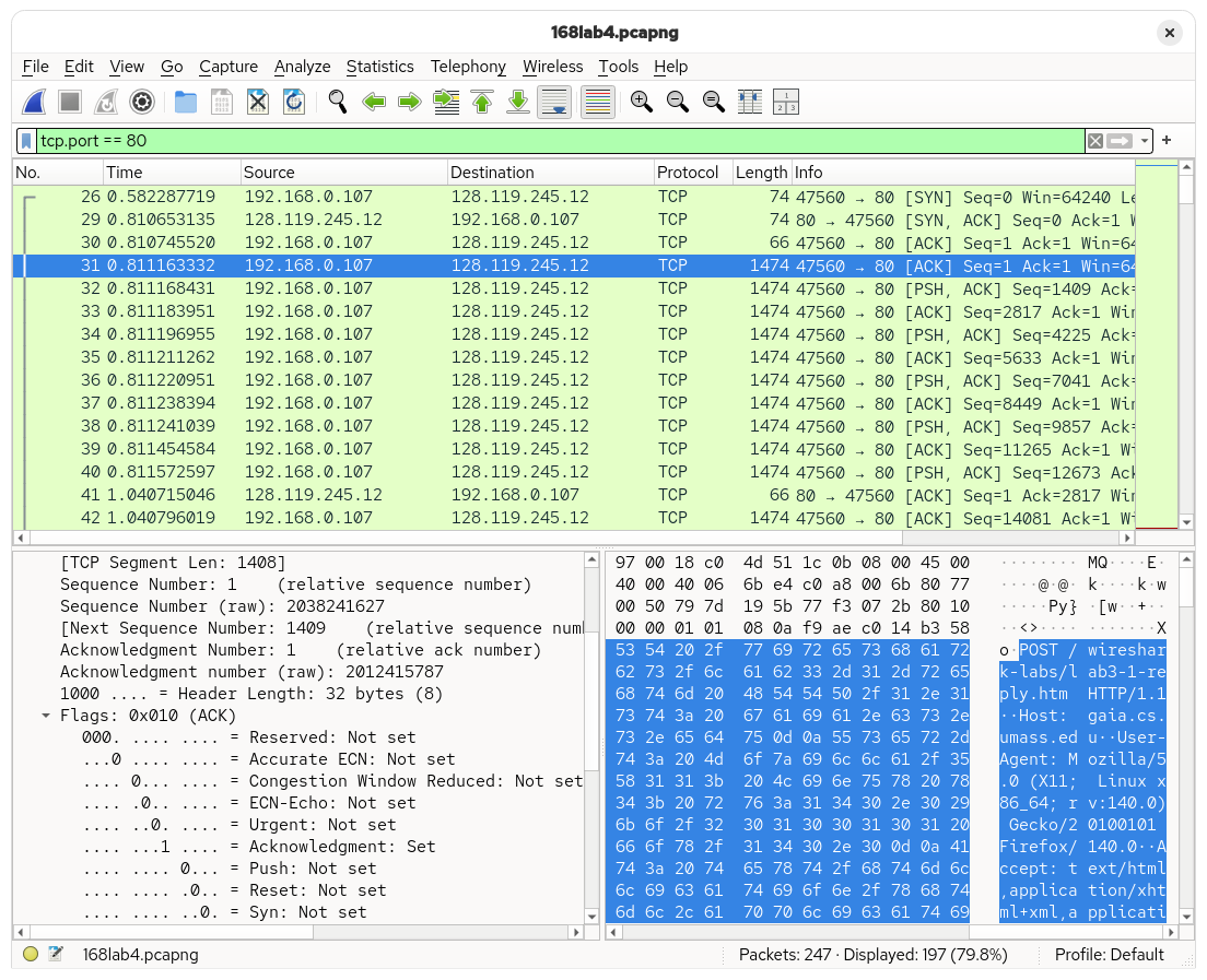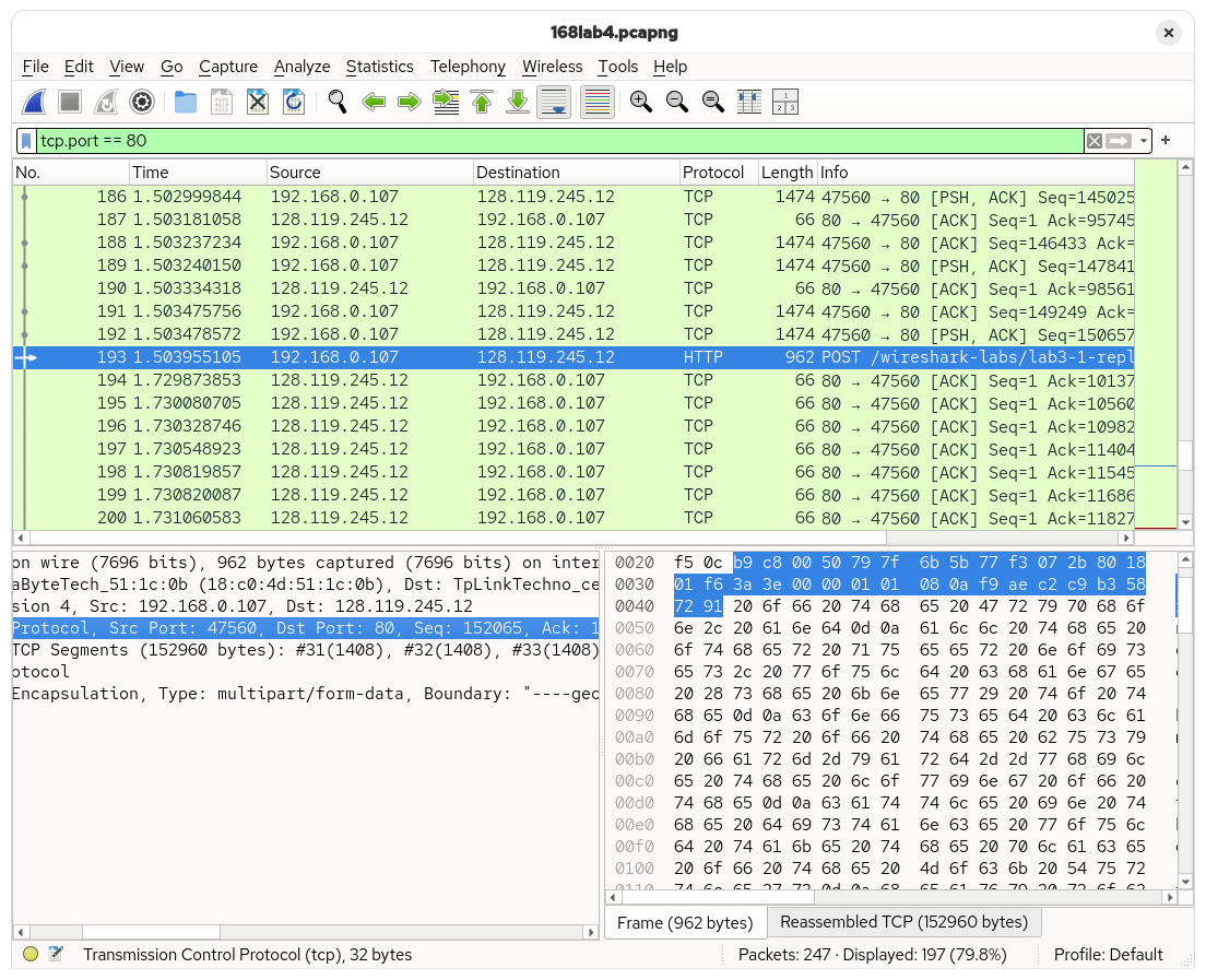 The POST request from the upload was found in the capture trace. It can be seen that the request came from the local computer (192.168.0.107) to the remote server (128.119.245.12). The connection used a local port of 47560 to communicate with the remote server, which is on port 80.