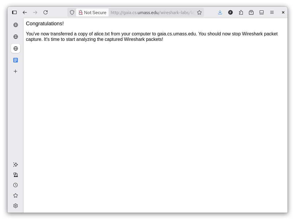 Before performing the laboratory exercise, the upload page (shown above) was loaded on the computer. The sample file was downloaded as well. The setup can be done while Wireshark is set to capture packets, but it was done beforehand as the exercise is focused on the upload of the sample file. This made sifting through the packets much simpler and clearer.